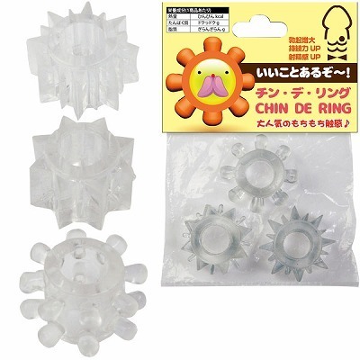 複数同時に装着すれば更に強力サポート!お得なペニスリング3個セット「チン・デ・リング」。勃起増大や持続力UP、射精感UPに!柔らかくモチモチ感触の丈夫なエラストマー素材を採用した男性用補助グッズ。それぞれ形状が異なる刺激的な突起がついているので、単品使いから複数同時使いまでマルチに楽しめる3個セットです。