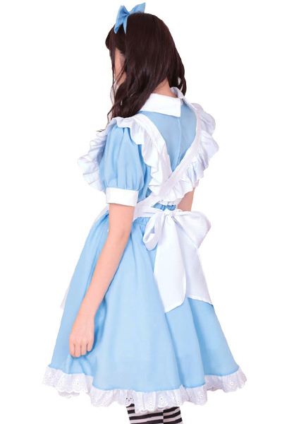 ●パステルブルー×ホワイトカラー●丸襟&パフ袖&裾レースワンピ●フリルいっぱいの白いエプロン●大きなリボンカチューシャ付き。