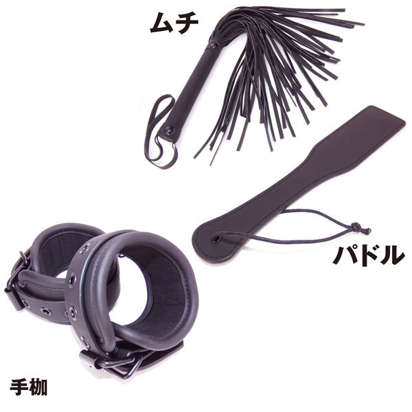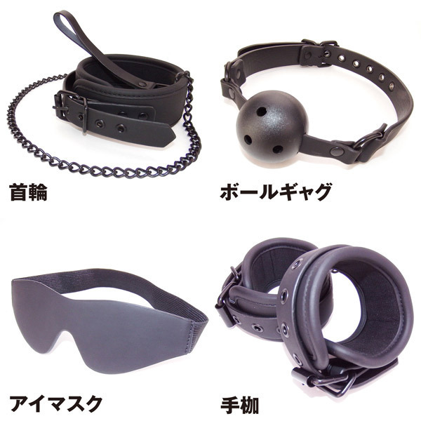 セット内容:首輪、ボールギャグ、アイマスク、足枷、パドル、ムチ、手枷