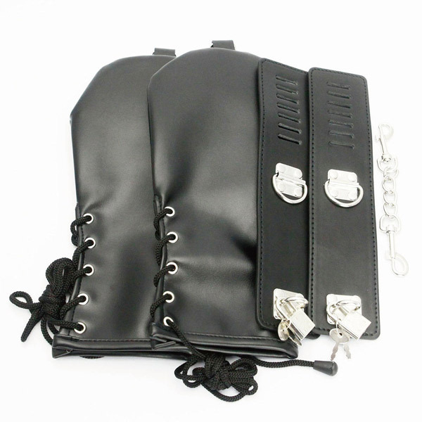 両手をまるまる覆って完全拘束!光沢感のあるフェイクレザーを使用した、手にはめてベルトで固定するグローブ手枷が登場。