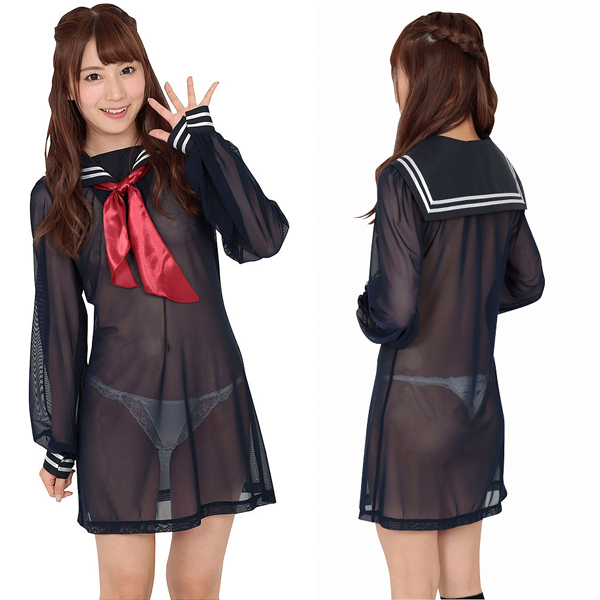 素肌ががっつり見えちゃうスケスケ仕様!シースルー生地で仕立てた紺のセーラーワンピース。