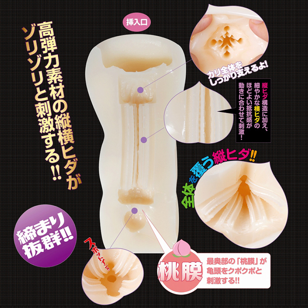 非貫通ならではのバキューム感と硬め素材の締め付けが、内壁に張り巡らされた縦横ヒダをしっかりアピール!最奥には亀頭をクポクポとはめ込むような「桃膜」が配置され、全方向から貴男のムスコを激しく責める!ローション付属
