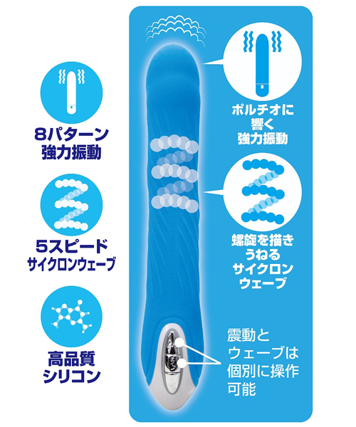 個別操作可能な8種類の振動パターン&5段階のスピードウェーブを搭載!先端に内蔵された強力モーターの強烈な振動がGスポをグリグリと刺激する♪素材は医療用の高品質シリコンを採用、生活防水仕様。