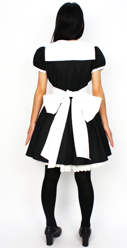 セット内容:ワンピース(後ろファスナー、袖パフスリーブ、全円スカート、内側に襟固定用のボタン付)・エプロン・ペチコート(裾レース付、ウェストゴム仕様)・カチューシャ・ブローチ(安全ピン付)