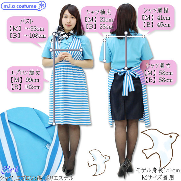 Mサイズ シャツ:B〜93cm・肩幅41cm・袖丈21cm・着丈58cm ジャケット:B〜90cm・肩幅40cm・袖丈58cm・着丈53cm スカート:W〜72cm・H〜89cm・着丈53cm エプロン:総丈99cm スカーフ:89×89cm