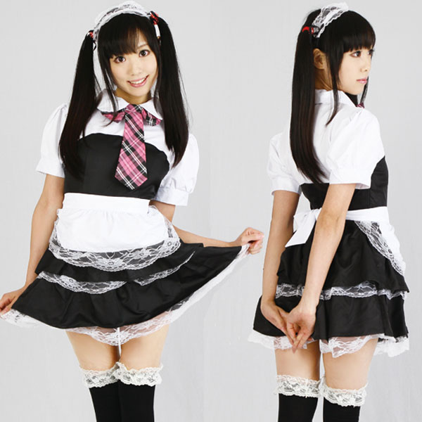 丸襟にピンク色のチェック柄チョーカーリボンが可愛いメイド服コスプレ。