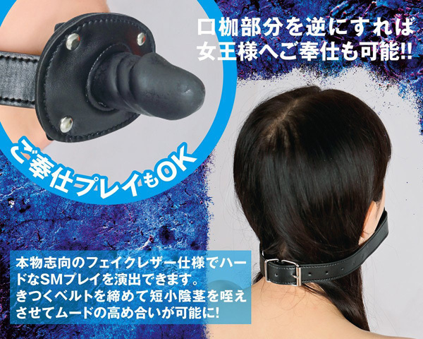 ●口枷・短小陰茎ver●高級フェイクレザー素材を採用●奉仕プレイも可能なミニディルド付き●サイズ→ベルト調節可能。 パートナーの悶える姿を見たいならディルドをお口に…、ご奉仕プレイがご希望ならディルドを外側に向けて装着!様々なプレイを楽しめるSM調教グッズです。 別売りの同シリーズ「首枷(e22507)」と併用すれば、わんこプレイも楽しめます。 |