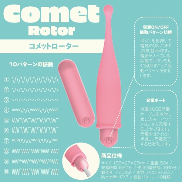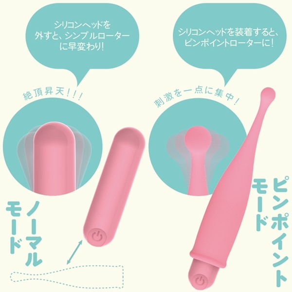 使いやすさとパワフルさを兼ね備えたピンポイントローターです♪小さめのボディでありながらも、ヘッド部分にシリコン素材を採用し、肌に優しい心地良い刺激を届けます!ピンポイントモードで集中的に狙う使い方と、ヘッドを外して広範囲に使えるノーマルモードの2WAY仕様なので、気分に合わせた使い方が可能♪ワンボタンで10種類の振動パターンを選べる操作も簡単です!IPX7の完全防水設計なので、お風呂でも安心して使用できますよ♪