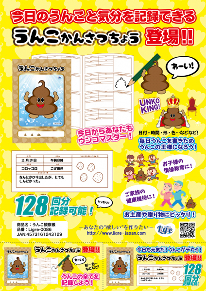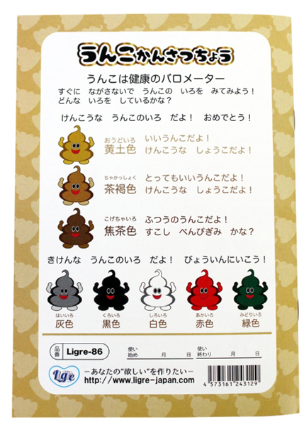 毎日の体調管理にうんこ日記をつけよう!日付、時間、うんこの形や色などの状態管理用の項目のほか、ひとこと日記など一冊で128回分の記録が可能♪夫婦やカップルさん、家族みんなが毎日元気でいるために。