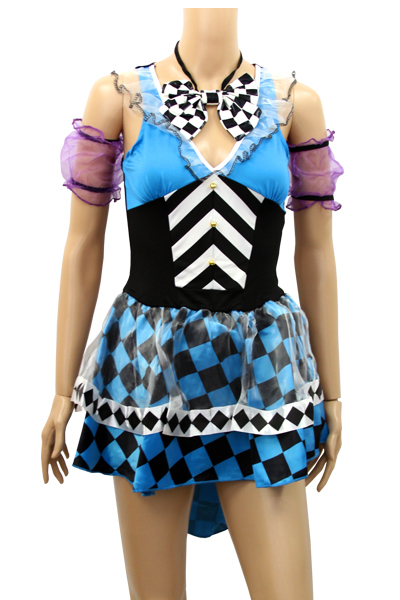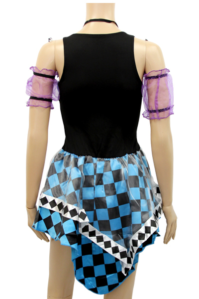 ブルーをベースに紫×黒とハーリキンチェック柄を随所にちりばめたオシャレでポップなミニドレス。