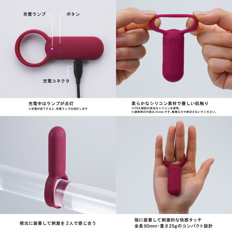 ●FDA認証済みで安全・赤いソフトシリコンを採用●リング直径31mm・適度に伸縮します●充電中はランプが点灯・60分のチャージで約60分間稼動●ワンボタン操作・5段階の強弱と2種類のパターンを搭載●水深50cmまでの生活防水加工●専用USBケーブル&ケース付き●水溶性ローションのみ併用可。