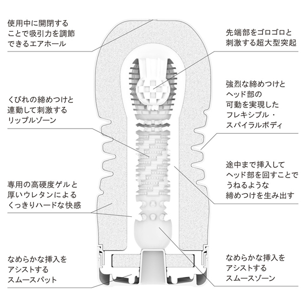多くのユーザー様の声に応えて更に愛される「TENGA」としてリニューアル!蛇腹からネジのようなスパイラル形状にしたことで、より連続締め付けを体感できるようになりました♪内蔵されていたボールはダイレクトに先端刺激を味わえる大型突起へ変更。