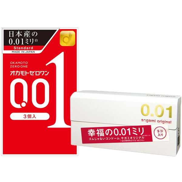 世界最薄0.01ミリを体感!ゴムじゃないコンドームでお馴染み、相模ゴム工業の「サガミオリジナル0.01」5個入と、オカモト史上最薄、異次元の密着感を実現した、うすさ0.01ミリ台のポリウレタン製コンドームのセット