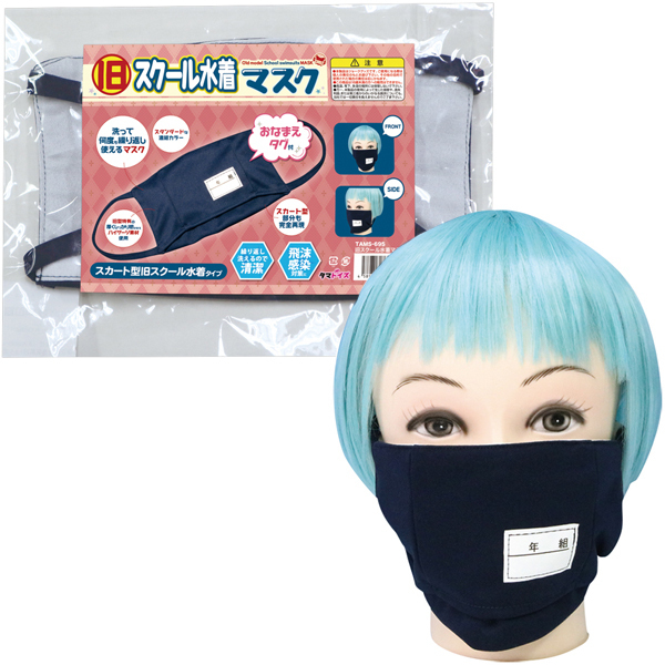 スカート部分まで完全再現!洗って繰り返し使える人気の旧型スク水風に仕立てたネイビーカラーのユニークマスク。