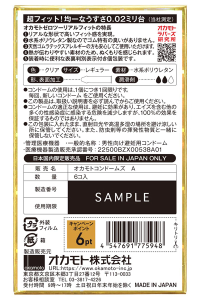 ●オカモトゼロツー・リアルフィットver(6個入り)●精液溜りをなくし密着感をUP●ラテックスアレルギーの方でも使えるポリウレタン製●ジェルを多めに塗布・挿入をサポート●安心して使える日本製。