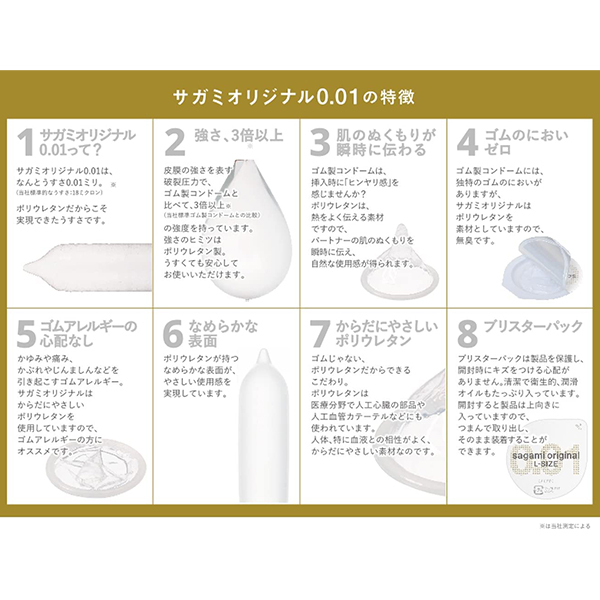 幸福の0.01ミリで使い心地は抜群♪まるで生でしているような感覚でゴムが苦手な方でも安心!薄くてつけていないかのような装着感をぜひ実感してください♪特別な日は001にしよう!ゴム臭もほとんど感じず、製品の品質も最高峰です。