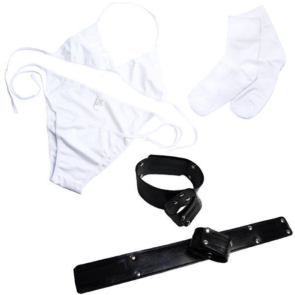 セット内容:手枷、もも枷、ブラ、パンツ、ソックス 重量:254g 日本製