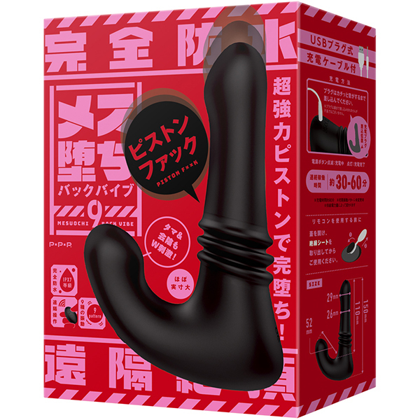 PPPより超強力ピストン搭載で完全防水&遠隔操作可能なアナニーバイブが登場!ピストンギミックは前立腺をズンズン刺激するメス堕ち構造!9パターンの高速ピストンで止まらない&止められないイキ狂い!タマ&会陰を刺激する強力モーター内臓でWの快感を味わえちゃう!女の子みたいにイケるメス堕ち仕様の優秀バイブ!いろんな遊び方を模索して、もっと新しい快感を見つけてくださいね!充電時間約90分、連続稼働時間約30〜60分(初期振動パターン未変更時)。