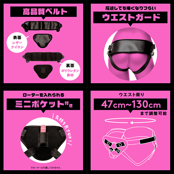 イキかた、責めかた、∞(無限大)!!男性凸女性凸男性凹女性凹色んな組み合わせが楽しめるペニバンです!ディルドはスナップボタンで4箇所留めしてしっかり固定!ベルトを引っ張るだけでフィットする簡単装着!シリコンリングが4種類も付いているのでディルドのサイズに合わせて装着が可能!ポリウレタン素材、レザーナイロンを使用した高品質なベルトを採用し、圧迫しても痛くなりづらいウエストガード付き。