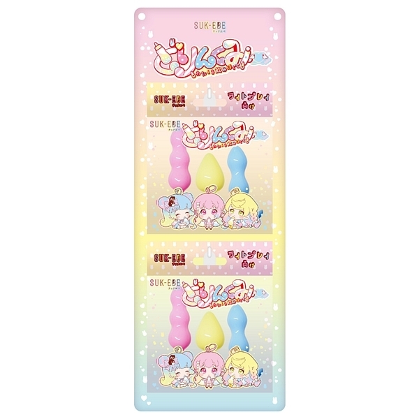 パッケージ:15.7×13.0×3.8cm 本体:ブルー(9.0×2.5cm)・イエロー(7.0×3.5cm)・ピンク(11.0×3.0cm)