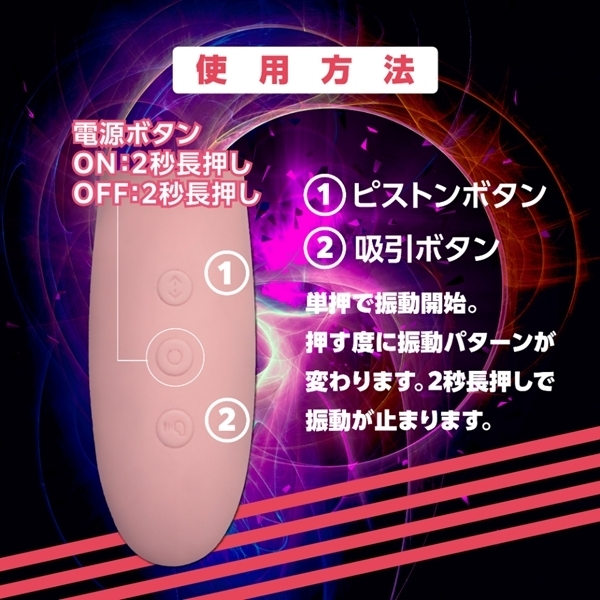 上下に激しく動く高速ピストンと、ソフトに吸引する機能が合わさり、2点攻めで圧倒的な刺激を実現!スムースなシリコン素材が肌に優しく、手にしっくり馴染むサイズ感で操作も簡単♪USB充電式で、最大60分の連続使用が可能。
