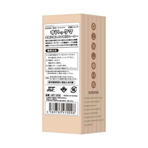 可愛いクマさん型の吸引ローターが登場♪見た目の愛らしさに反して、大口径の吸引口から強力な振動を楽しめます!簡単操作で、軽量・コンパクトな設計なので片手で楽々操作可能♪10パターンの吸引振動で、いろんなリズムを試してみてください!電池式だから、気軽に持ち運びもできて、いつでもどこでも可愛いクマさんと一緒に♪